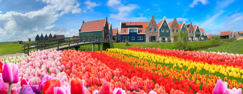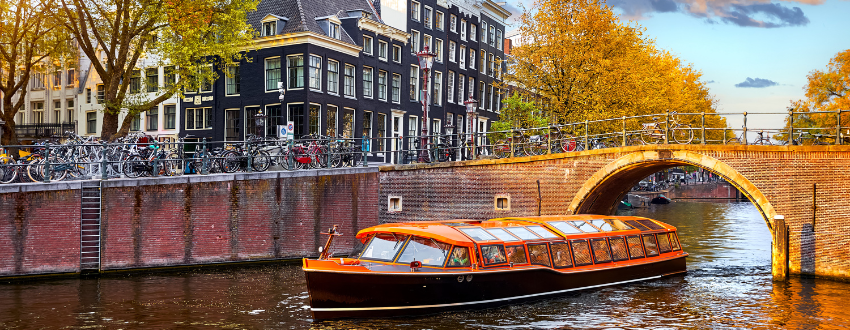 Visit Madurodam with 125 scale models of Dutch landmarks. Guided Amsterdam tour discovering history and icons. Visit Zaanse Schans village for windmills, houses, and workshops. Amsterdam canal cruise on a glass-top boat amid 1,000 bridges. Overnight in the Netherlands.
